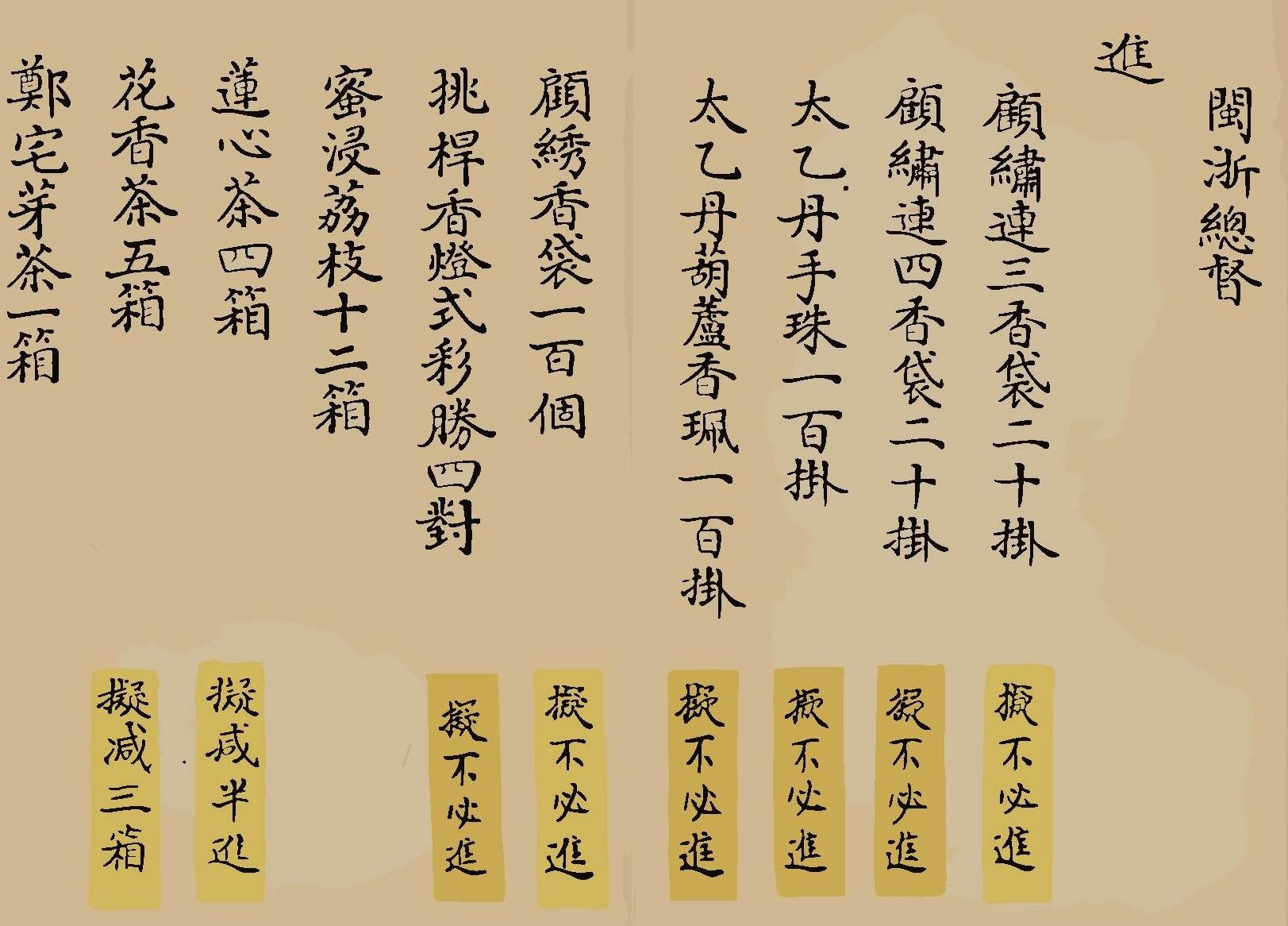 作为贡品,郑宅茶也深为皇室所珍爱。据乾隆年间《内务府奏销档案》记载:郑宅茶二匣。乾隆皇年六月《总管内务府奏销文件》记载为例,各地进贡茶叶多达六十余种。其中,乾隆皇帝最为喜爱的有武夷茶、郑宅茶等,其中武夷茶和郑宅茶尤为珍爱。以雍正七年(1729年)为例,全年皇帝赏赐云贵总督鄂尔泰共8次,赏赐物品有对联、吉祥十字、珍珠、茶等几十种。其中,“五月赏赐郑宅茶二匣,润七月赏赐莲心茶二瓶、茶膏一匣。”河东总督田文镜为赐茶谢恩事奏折,“皇上赐臣郑宅茶四小瓶,臣随跪迎进内恭设香案望”此奏折原件还保存在国家第一档案馆。